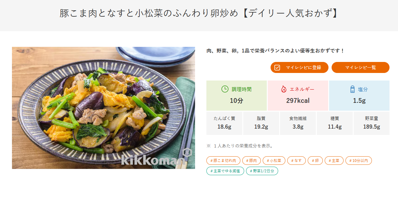 【豚こま肉となすと小松菜のふんわり卵炒め】を