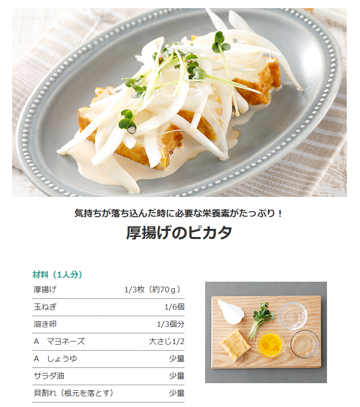 厚揚げはうつに効果的な必須アミノ酸、メチオニンやトリプトファンを含みます。生の玉ねぎに含まれるアリシンは、うつで不足しがちなビタミンB1の働きを助